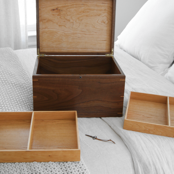Extra Large Walnut and Cherry Keepsake Memory Box with Two Trays, Lock and KeyMad Tree Woodcrafts®2025-05-13T18:58:25-05:00